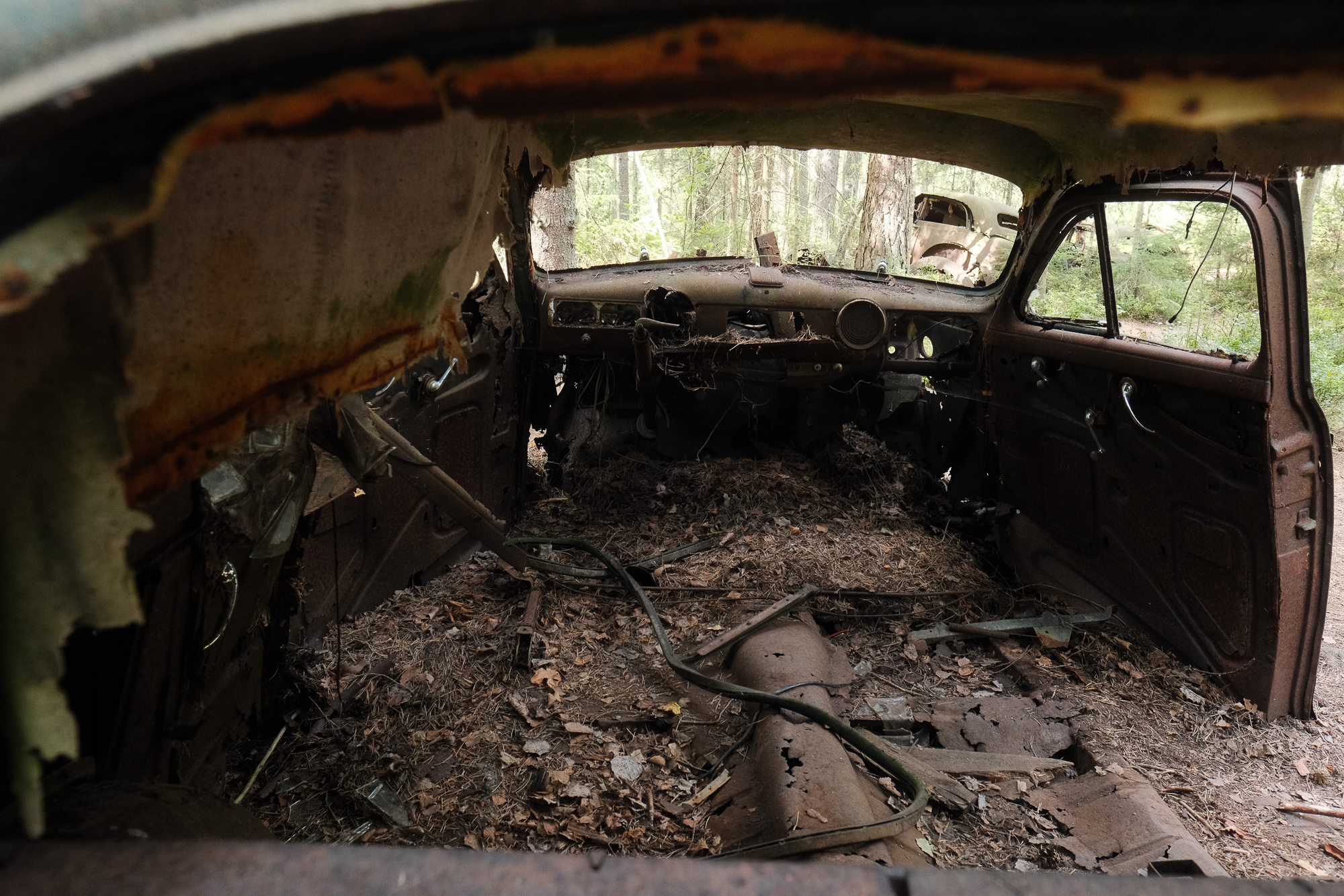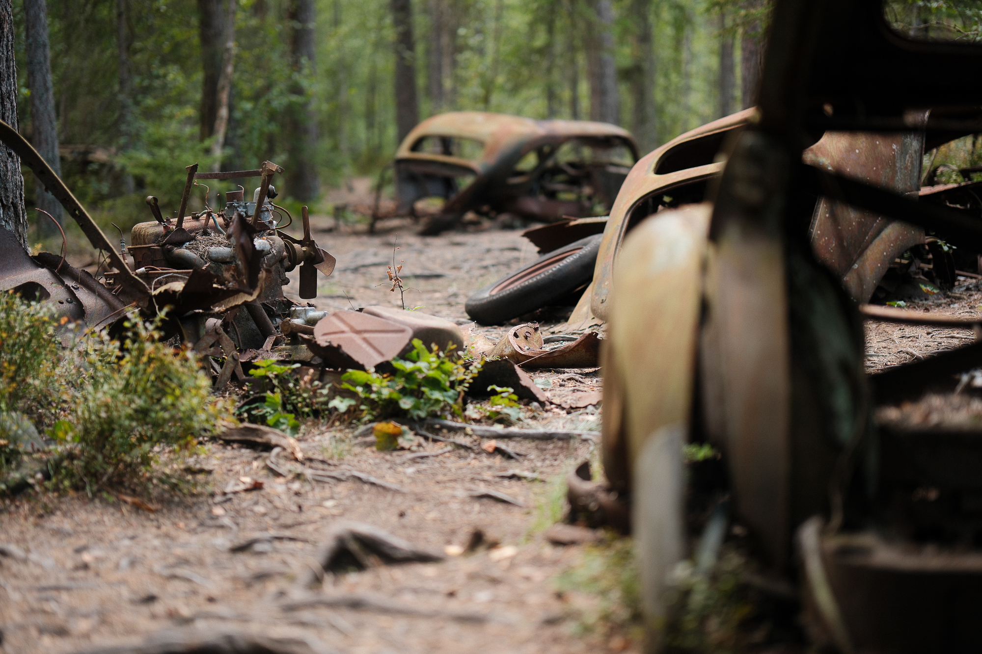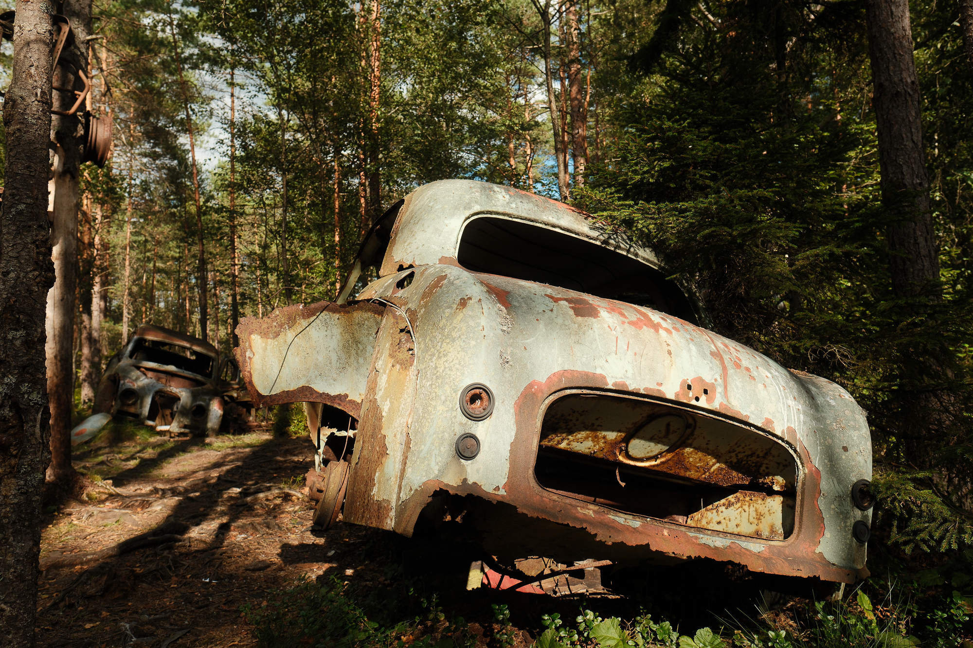the “car cemetery.” Around a hundred vehicles, maybe fewer now, sinking gradually into the ground. Nature is doing the rest: swallowing doors, peeling paint, splitting metal. The forest isn’t fighting the cars—it’s quietly digesting them.