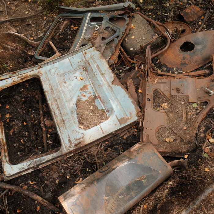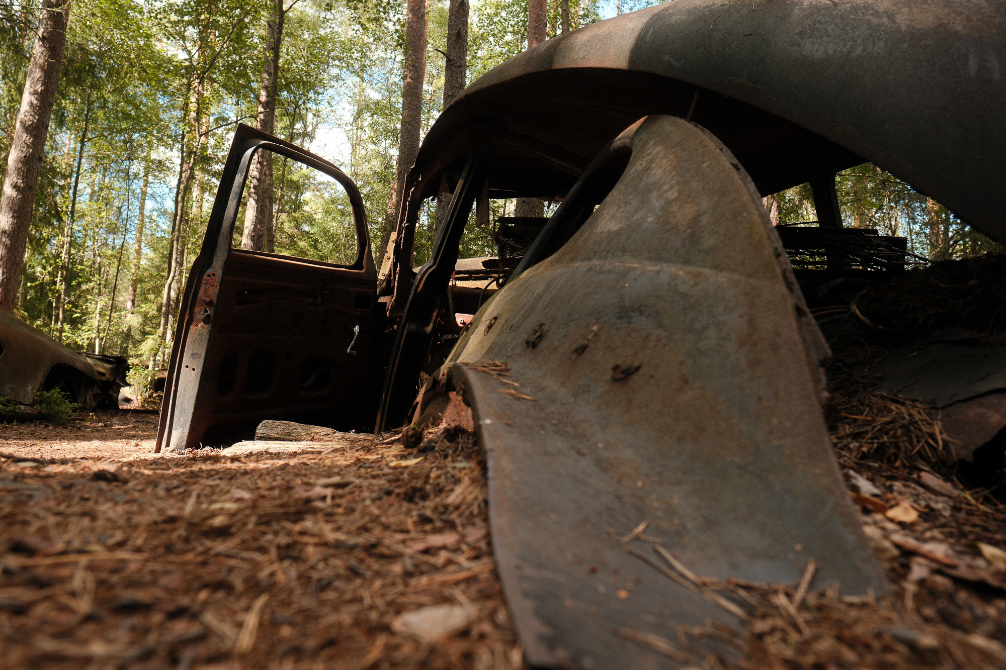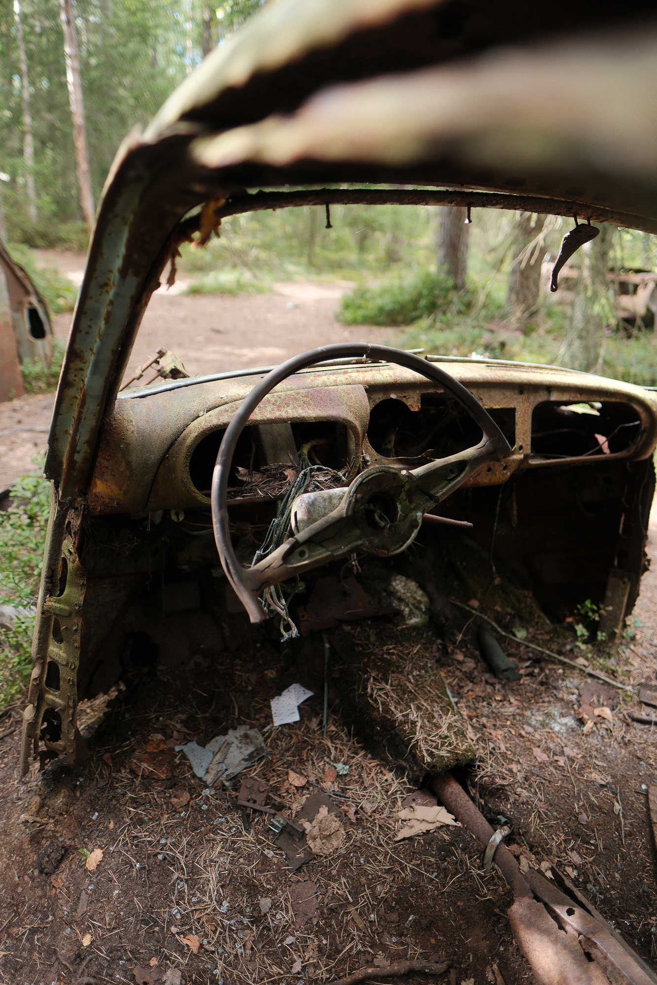the “car cemetery.” Around a hundred vehicles, maybe fewer now, sinking gradually into the ground. Nature is doing the rest: swallowing doors, peeling paint, splitting metal. The forest isn’t fighting the cars—it’s quietly digesting them.