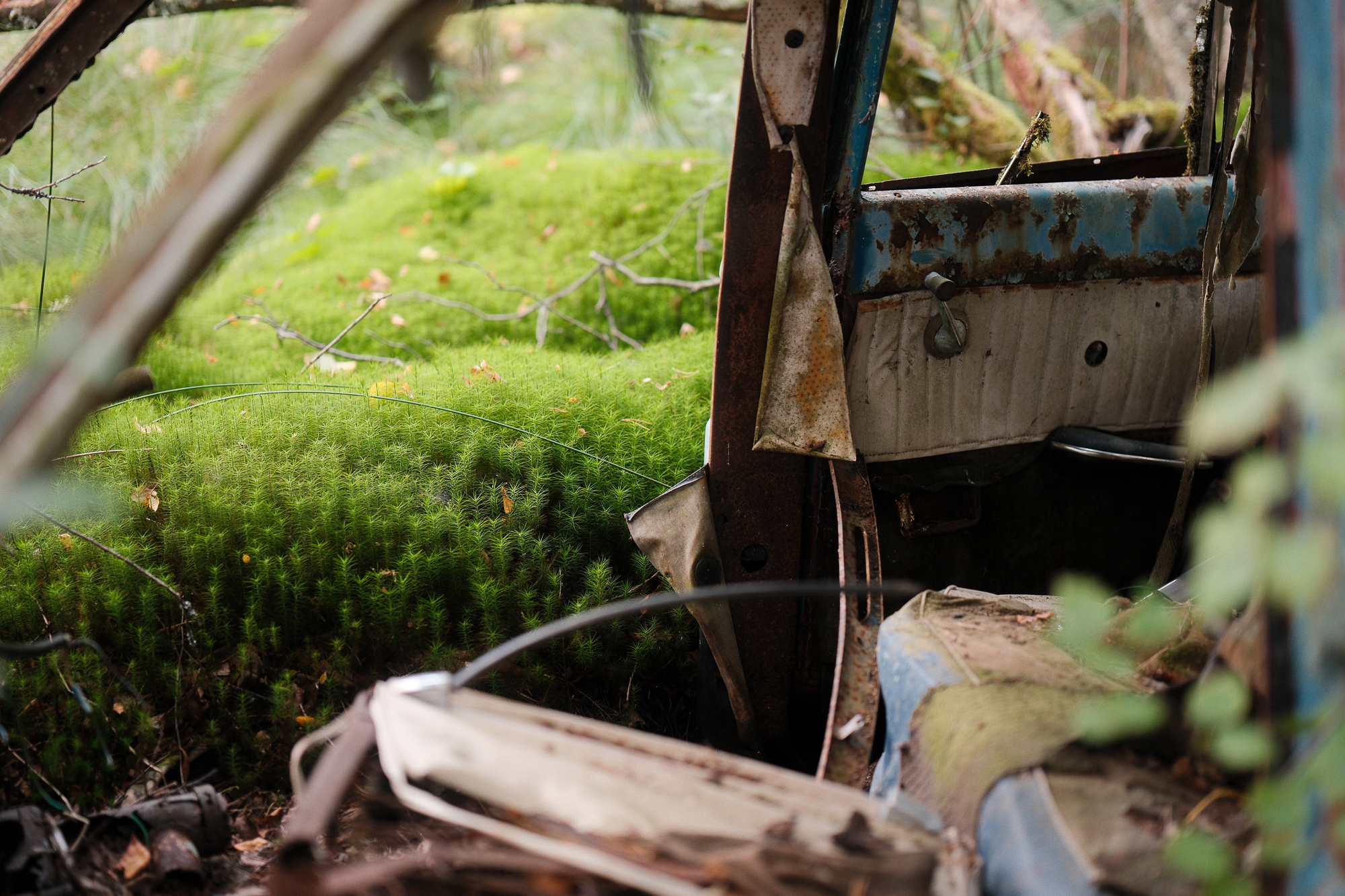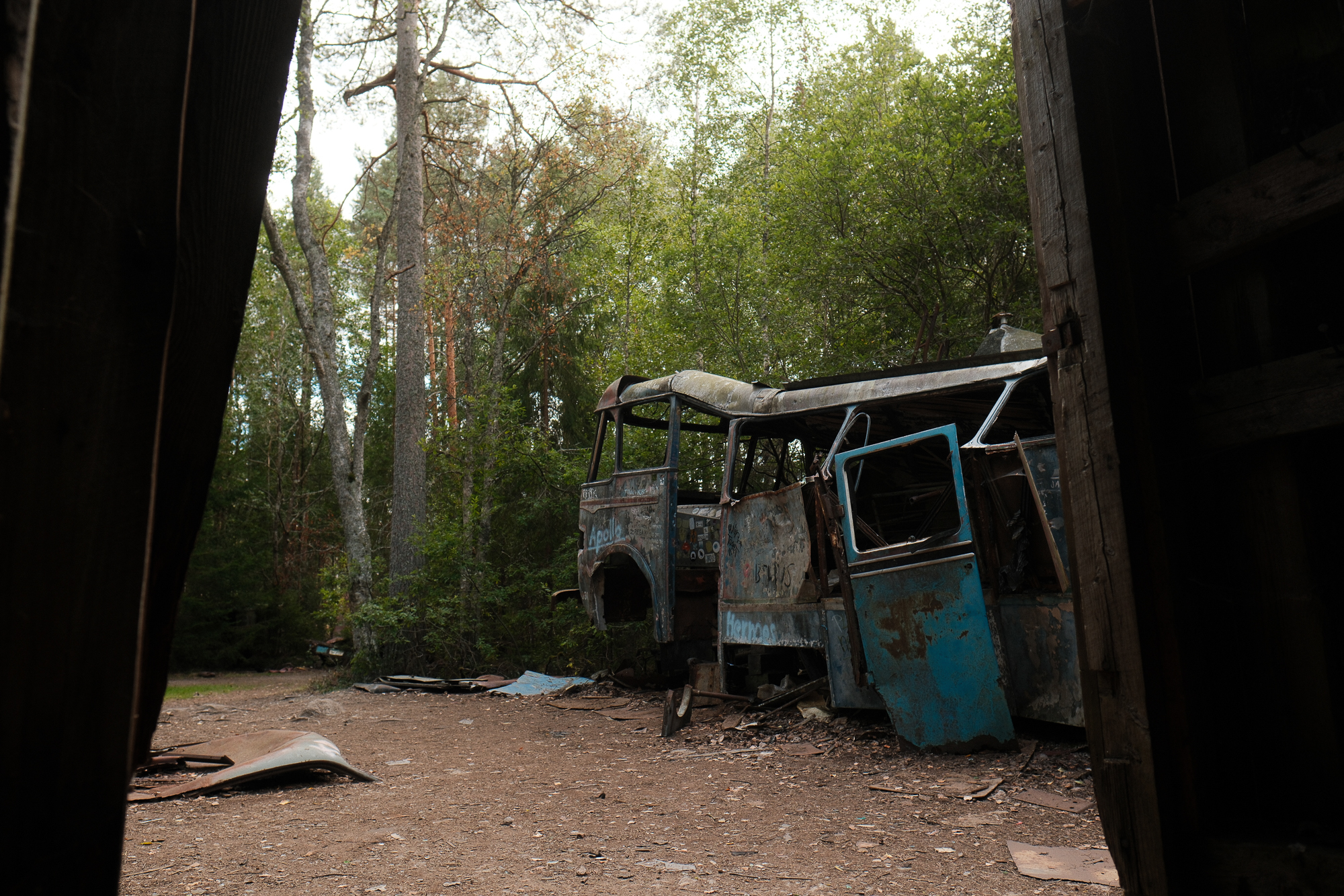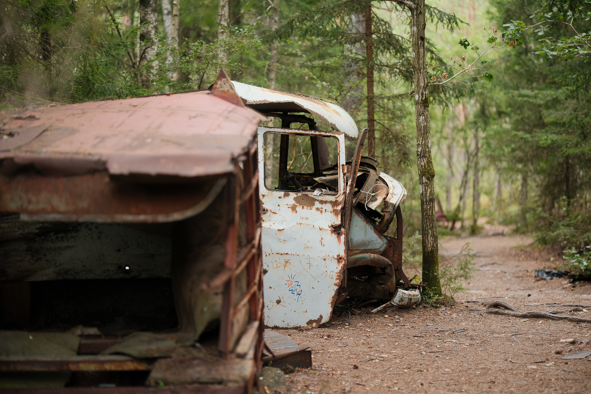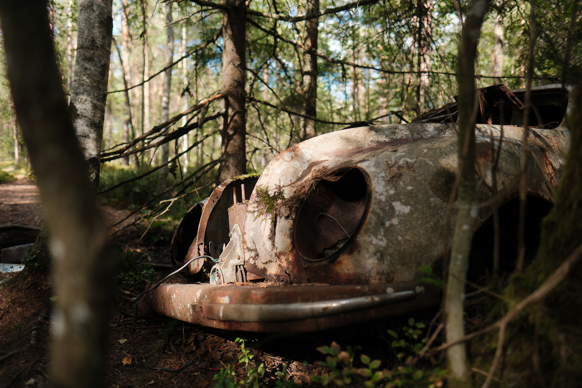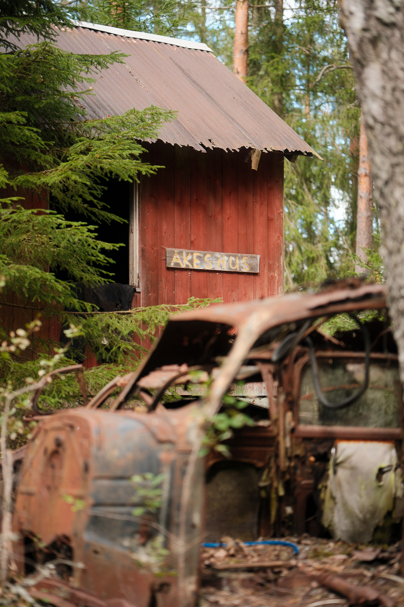 All the photos from this visit are straight out of camera. No editing, no corrections, no digital cleaning. Kyrkö Mosse doesn’t need embellishment. The colours are already there: the deep browns of rust, the saturated greens of the moss, the soft blues and reds from paint that refuses to die. Light filters through the trees in a way that feels natural and honest.
