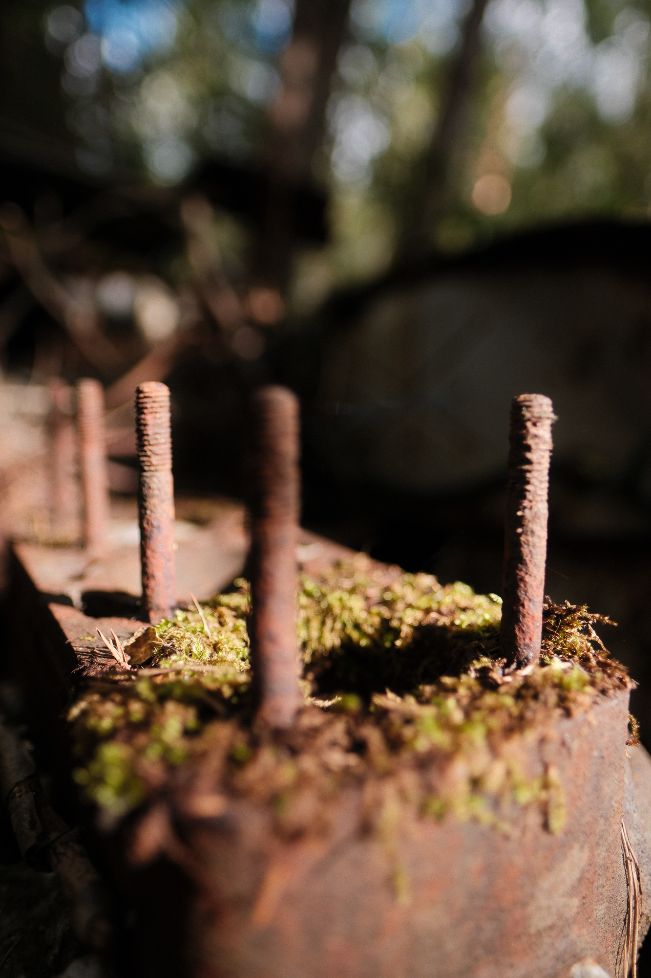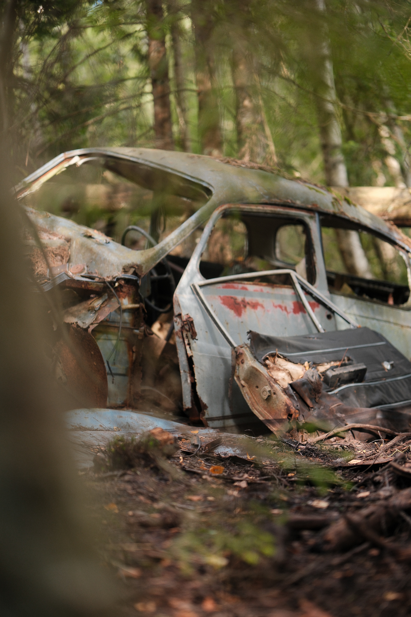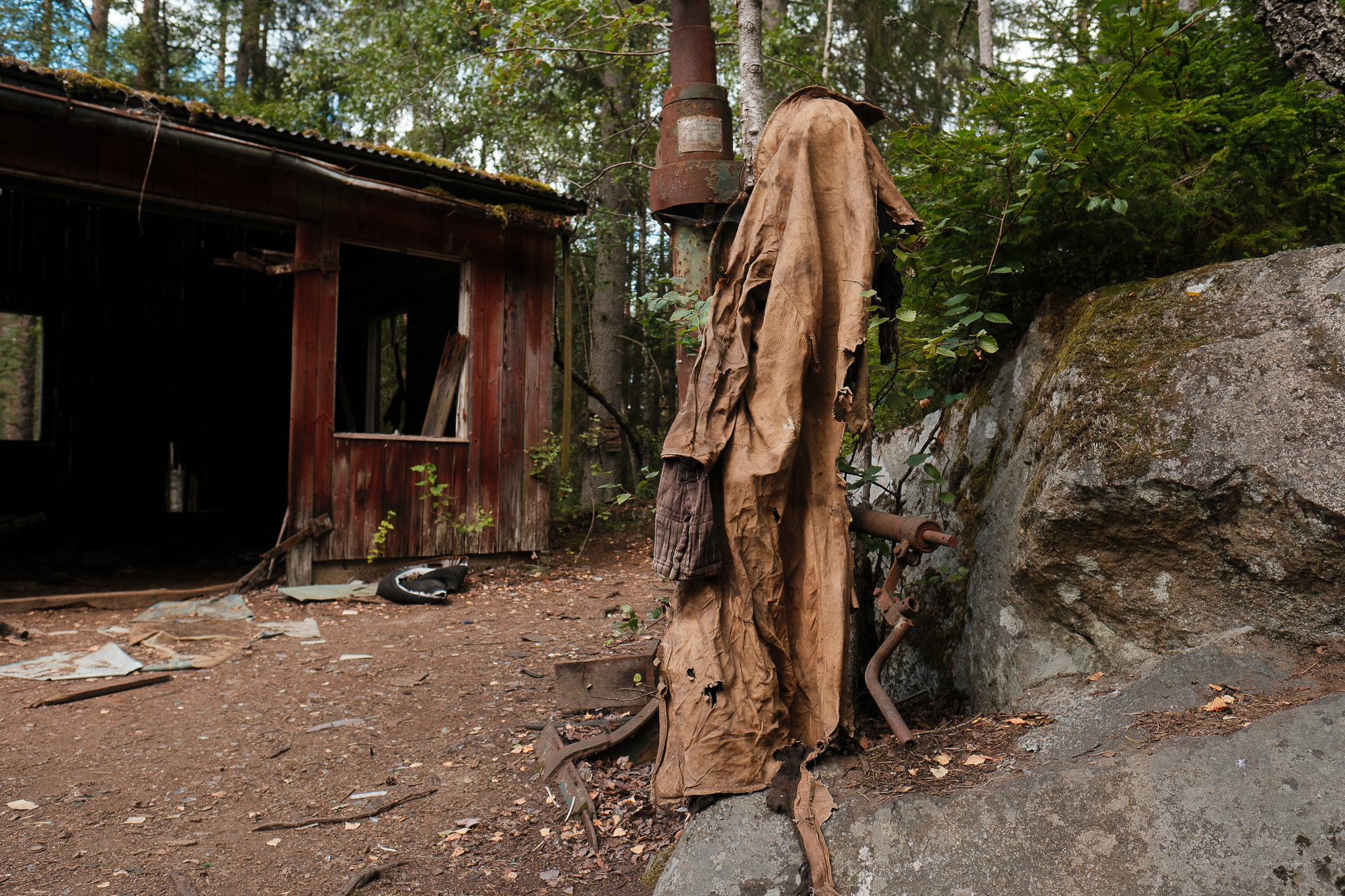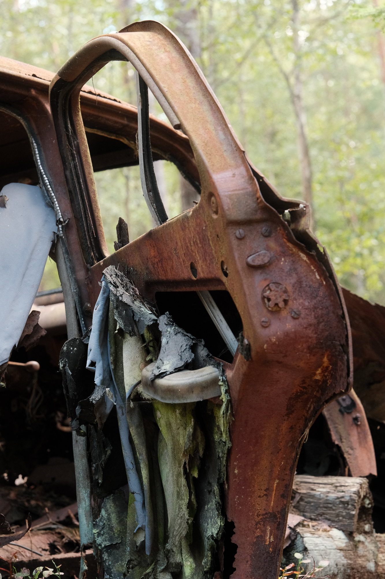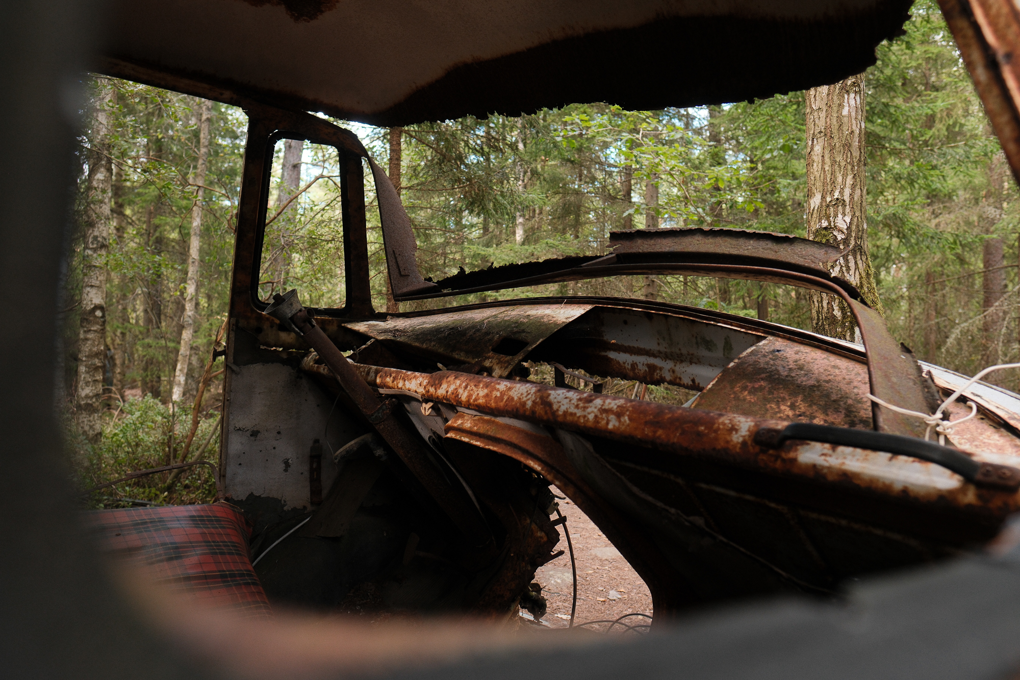 All the photos from this visit are straight out of camera. No editing, no corrections, no digital cleaning. Kyrkö Mosse doesn’t need embellishment. The colours are already there: the deep browns of rust, the saturated greens of the moss, the soft blues and reds from paint that refuses to die. Light filters through the trees in a way that feels natural and honest.