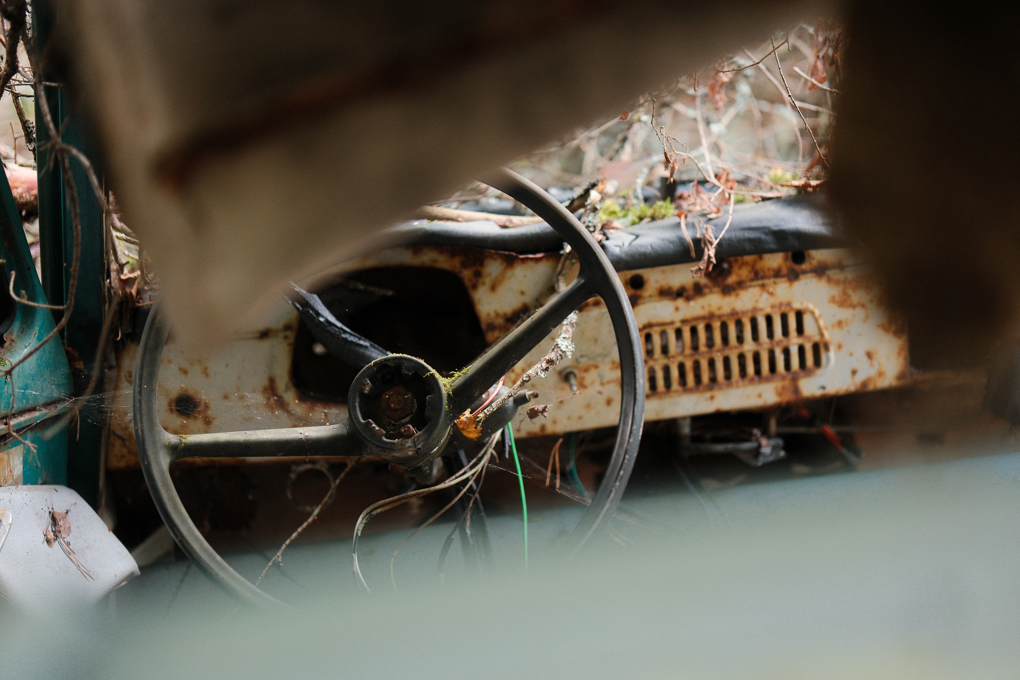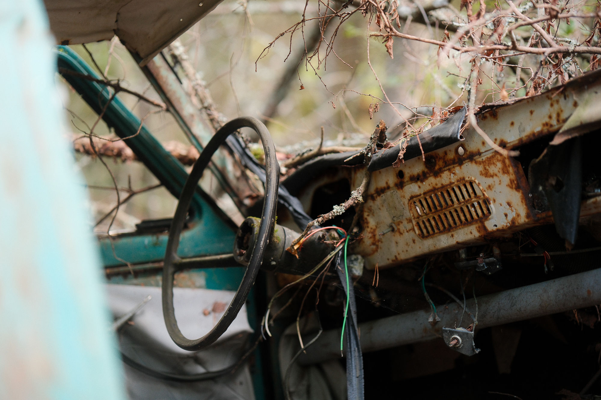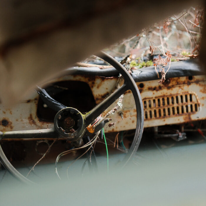 I ended up spending the entire afternoon there, without even noticing the time passing. It’s the kind of place that rewards slow movement. You take a few steps, and suddenly something catches your eye: a window frame eaten away by rust, a steering wheel sticking out of the ground like a fossil, a strip of faded blue paint glowing against the green.