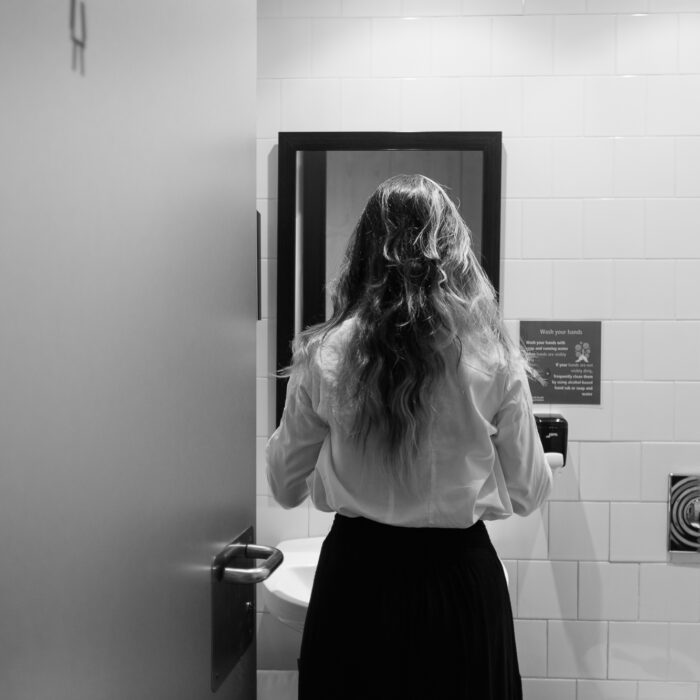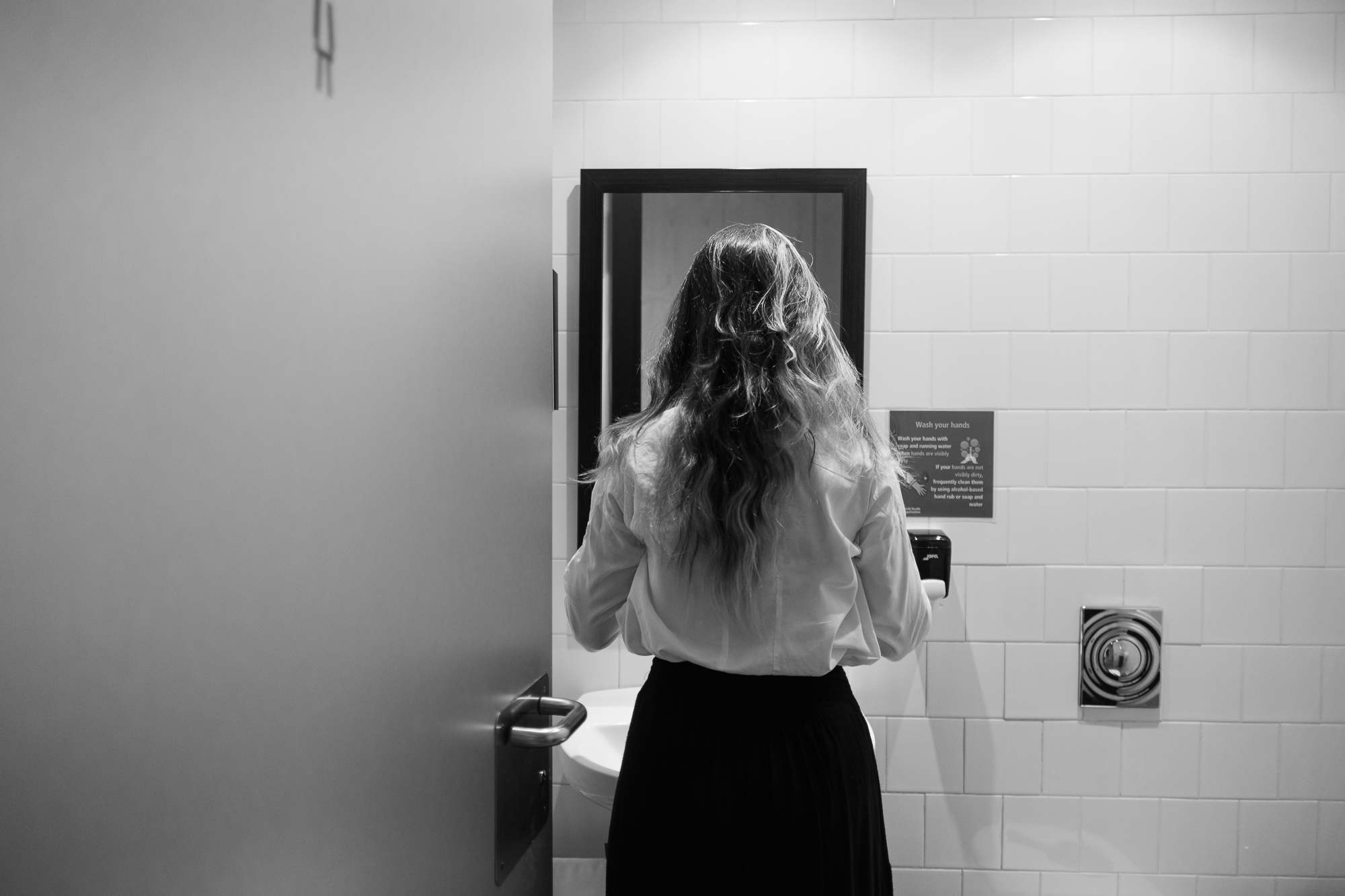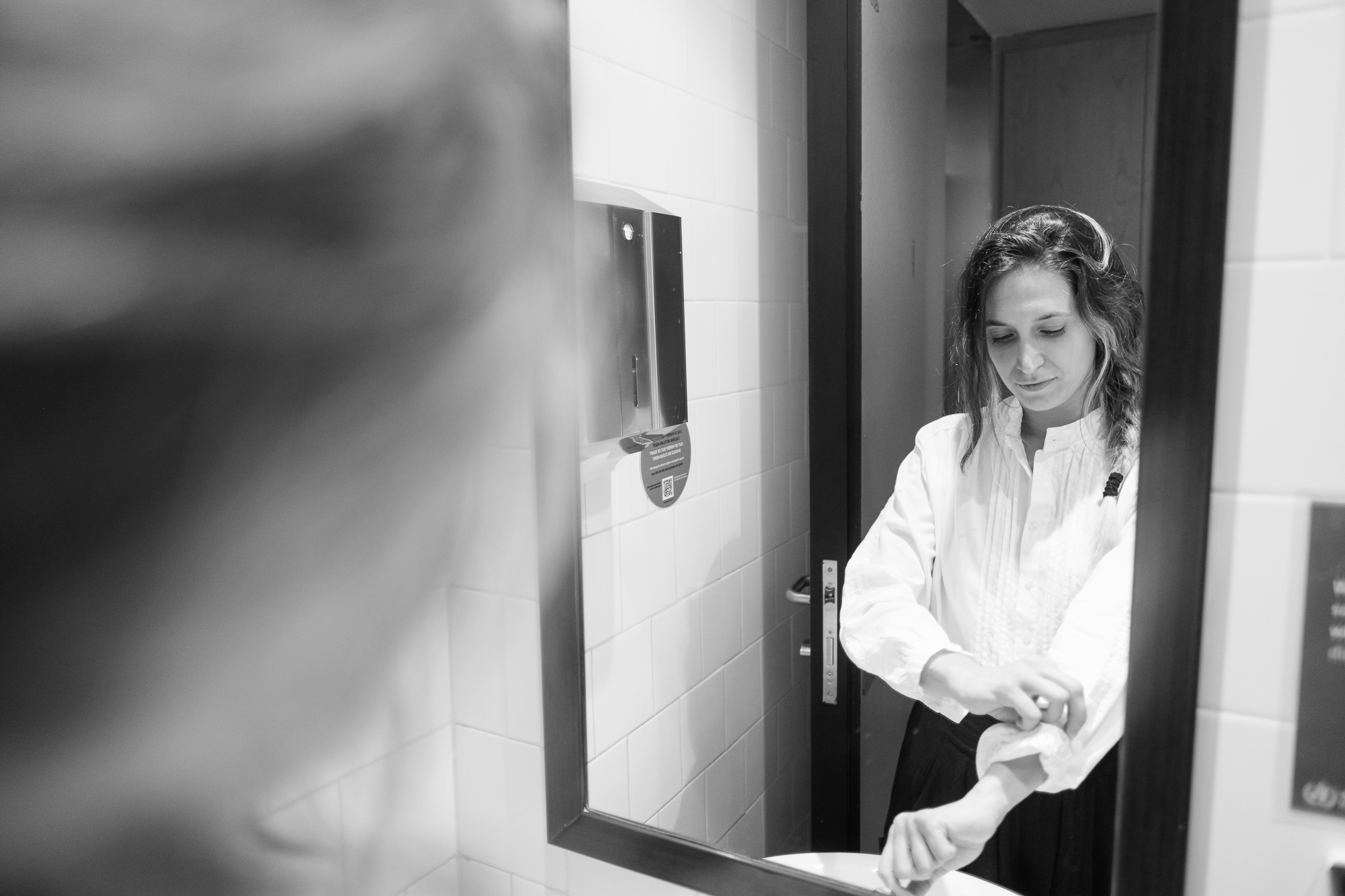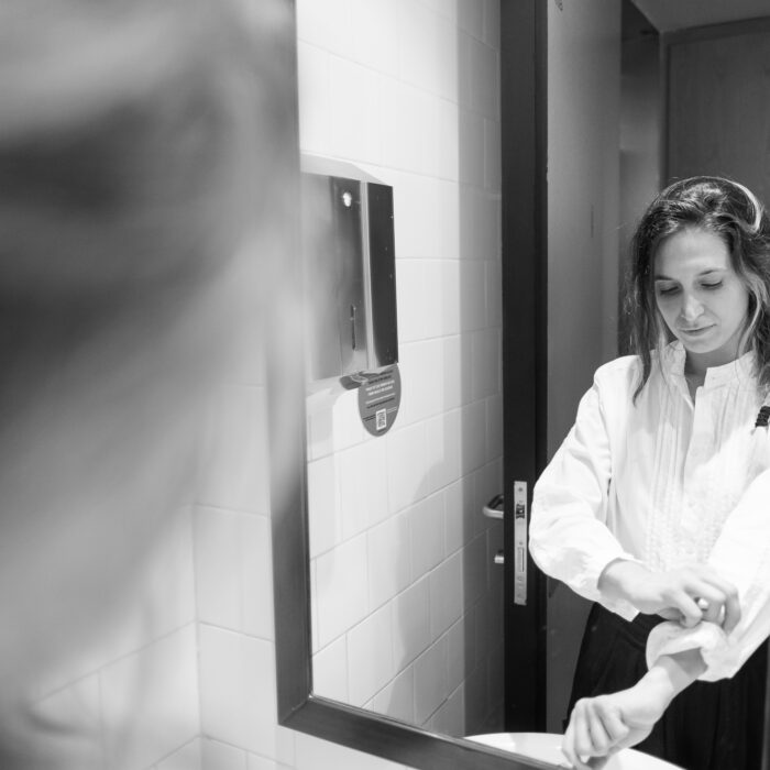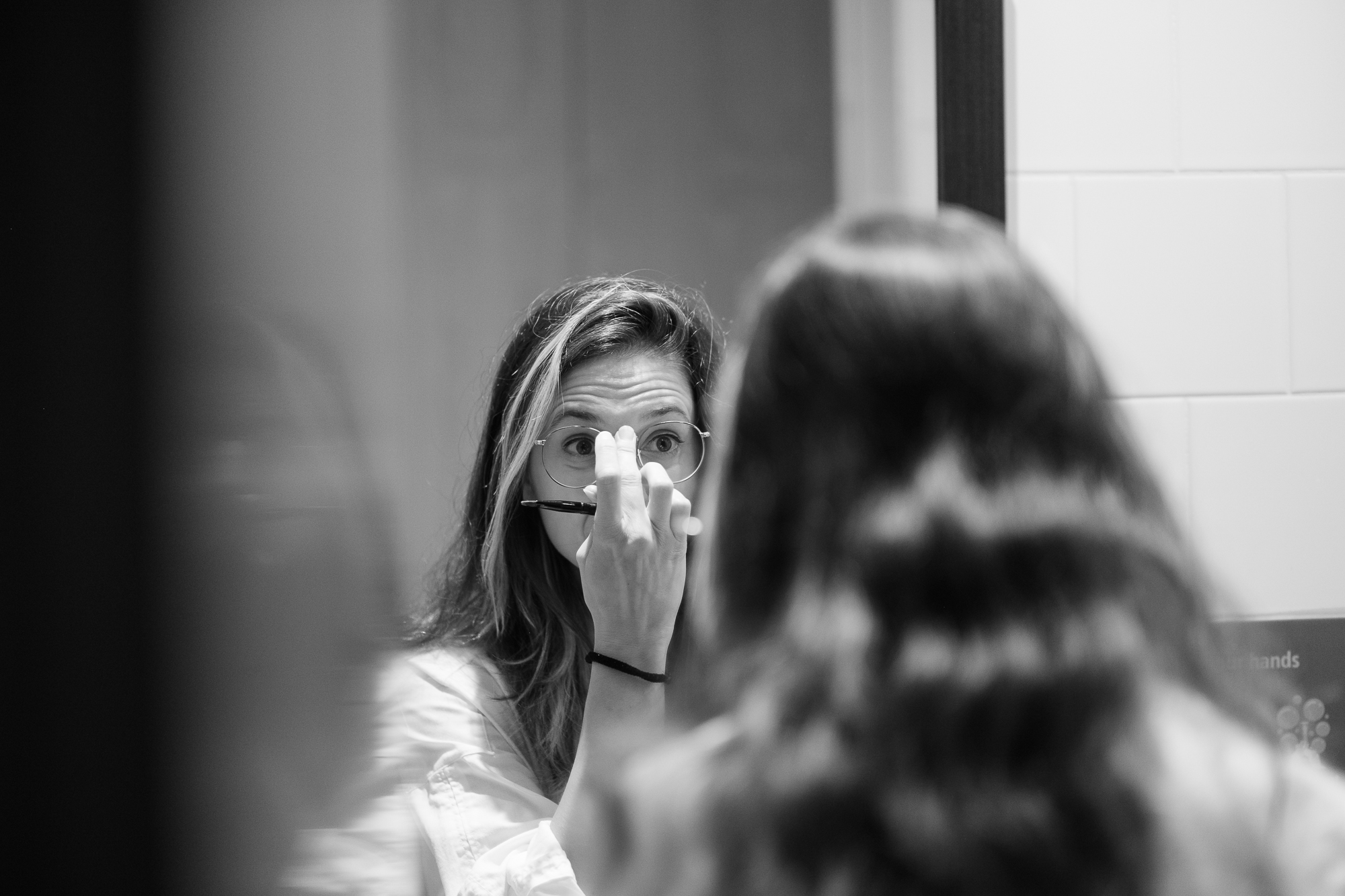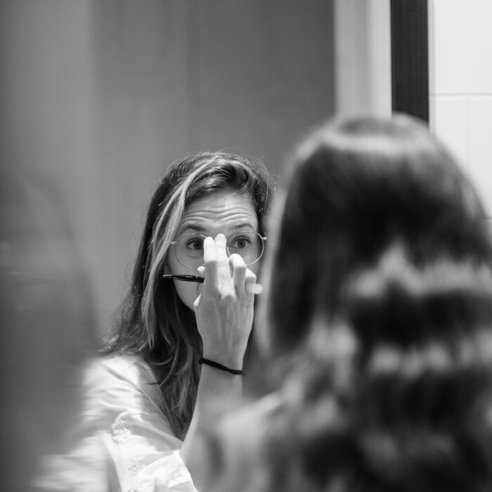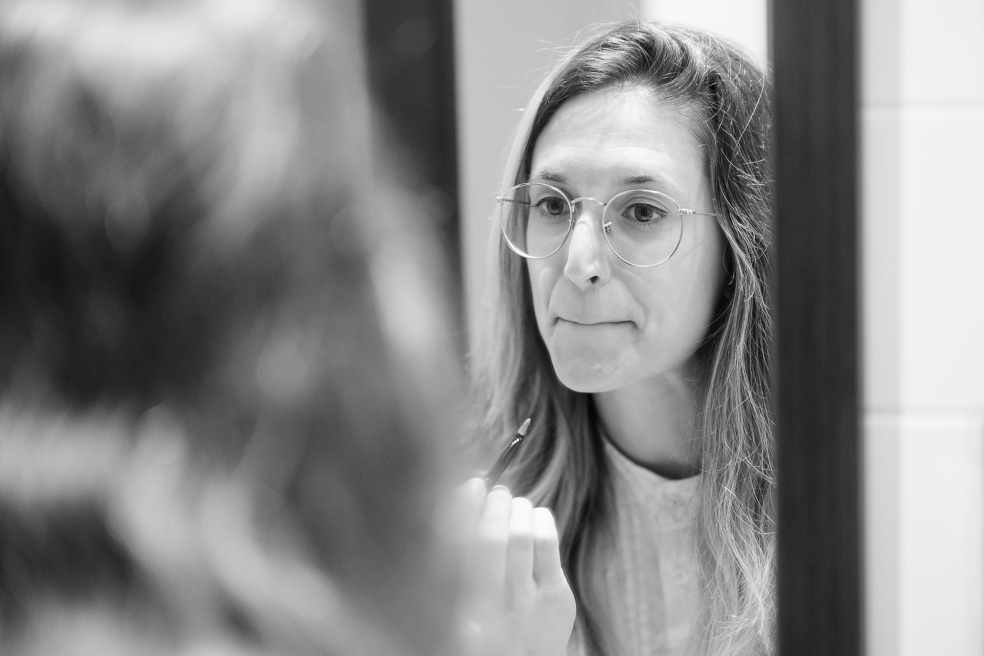 Alongside the formal portraits, I also included a few black-and-white behind-the-scenes shots. They’re more personal — moments of silence before the camera, her reflection in the mirror while fixing her hair or retouching her makeup. Those images don’t aim to present her as a “scientist,” but simply as herself: thoughtful, strong, luminous.
